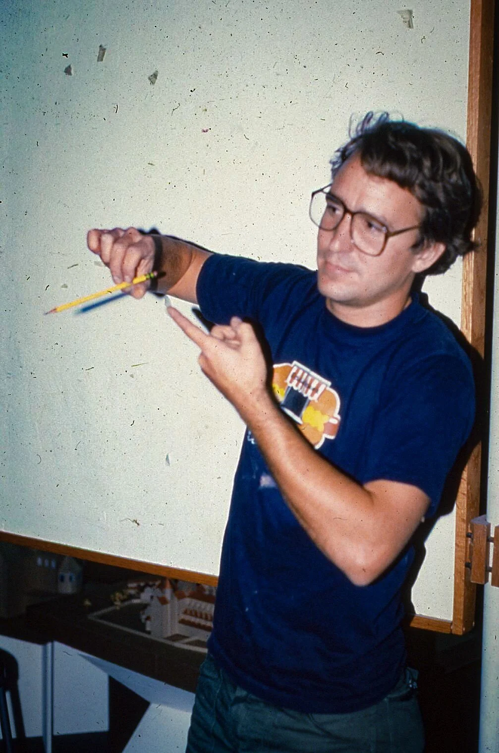 I suppose I've had an obsession with the pencil my whole life. As far as I'm concerned, all ideas seep from the tip of a pencil. In 1983, my pencil fever spiked, and a voice inside me said I HAD TO BUILD a GIANT PENCIL. Perhaps an appreciation for Claus Oldenburg contributed, but I realized that as this was my last year in Architecture School, and a Giant Pencil NEEDED to be built and then suspended from the rafters of the Centrum (the large indoor courtyard) of the School of Architecture at the University of Arizona in Tucson.