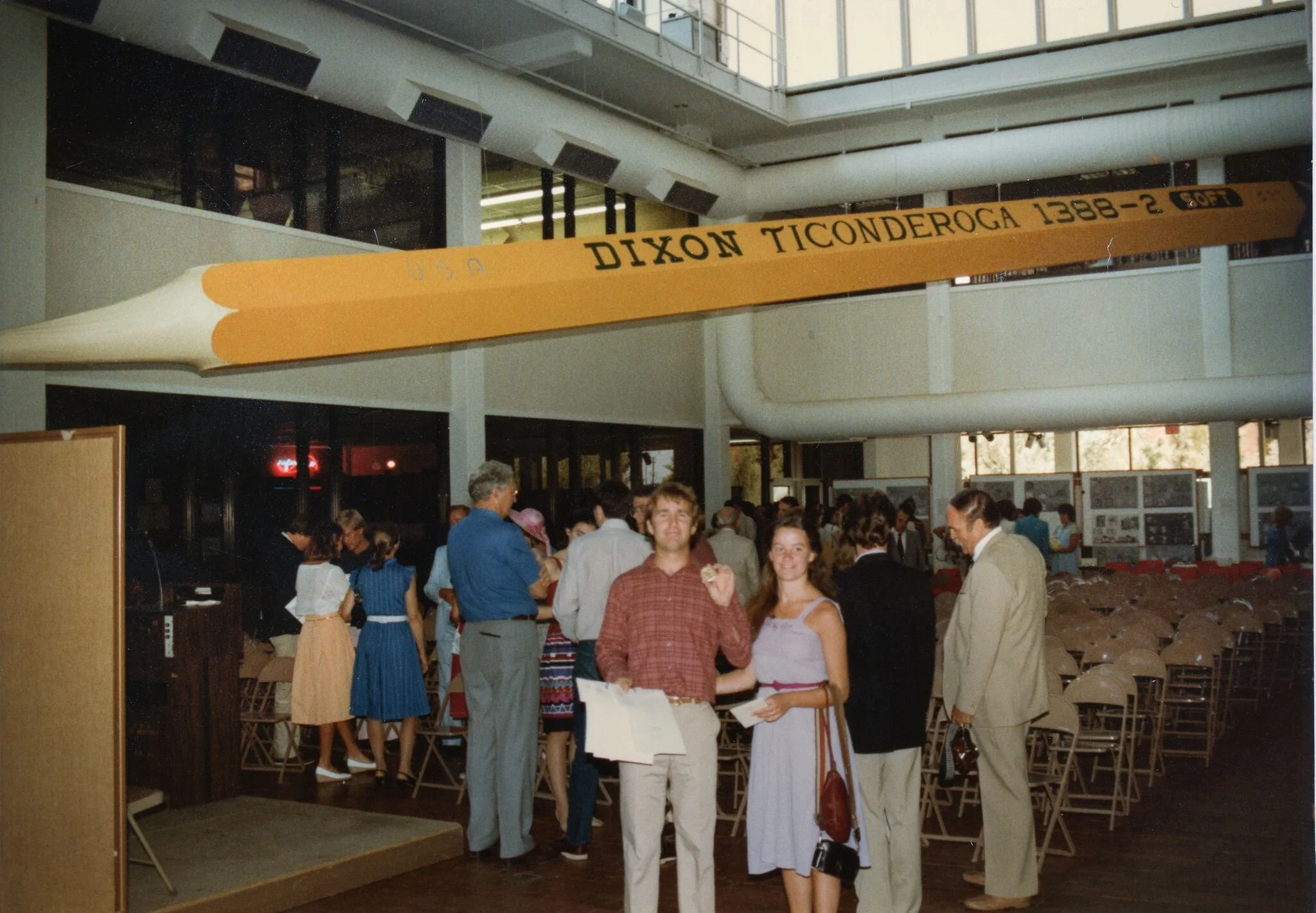 I got the word out that the pencil needed to be hung Saturday while the Dean was hiding in Phoenix, and rock climbers appeared from every direction. I didn't have to lift a finger. People were dangling from the trusses like it was a circus, and the Pencil was hoisted into place. The Dean came back on Monday, smiled, shook his head, and disappeared into his office. We had our graduation under the pencil, and then said goodbye.