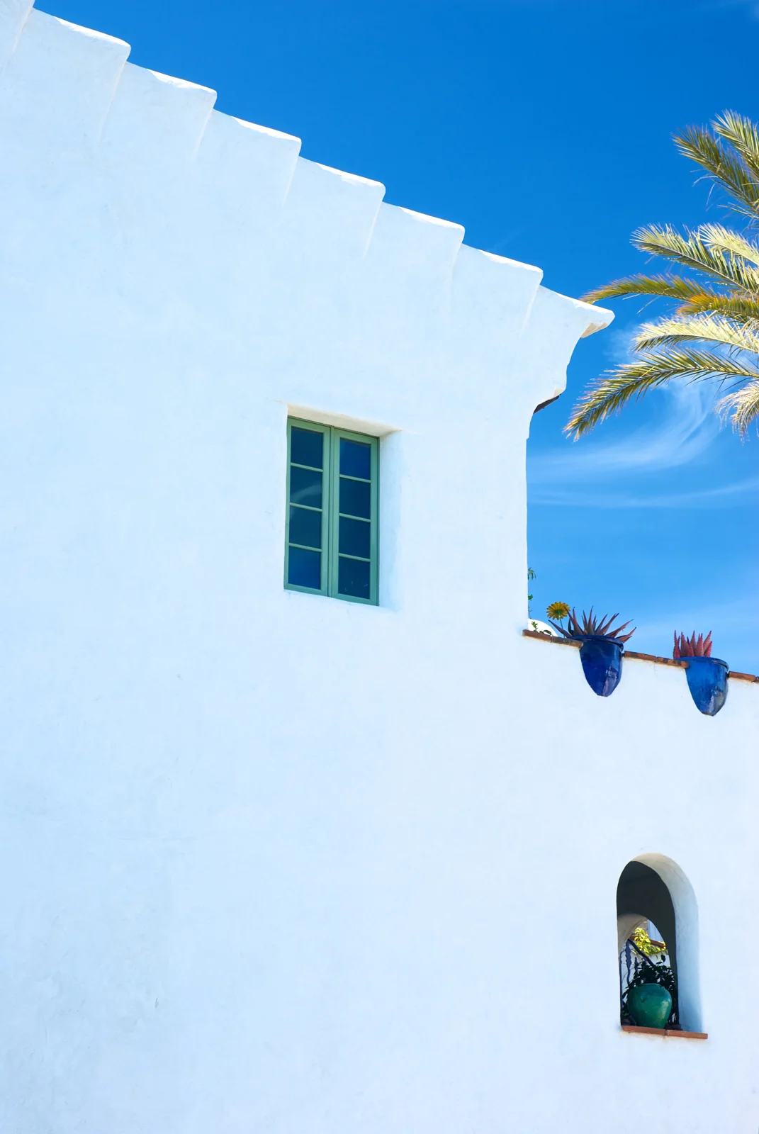 At the far end of a shallow alleyway in Santa Barbara’s El Pueblo Viejo neighborhood, a 19-by-19 foot four-story home wrapped in undulating white plaster has two large keyhole windows, an elliptical garage door, and a front light that dangles from a delicate iron pole stretching the length of the building. It’s somewhat Andalusian, a bit Dr. Seussian, and entirely beautiful.