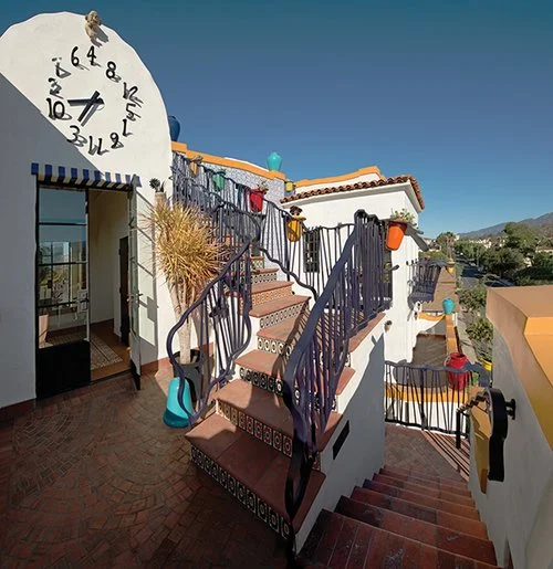 This whimsical live-work space in Santa Barbara's Presidio neighborhood could just as well be found in the pages of a Dr. Seuss book with a pueblo-inspired design accentuated by bright ceramic tiles and Escher-like details.